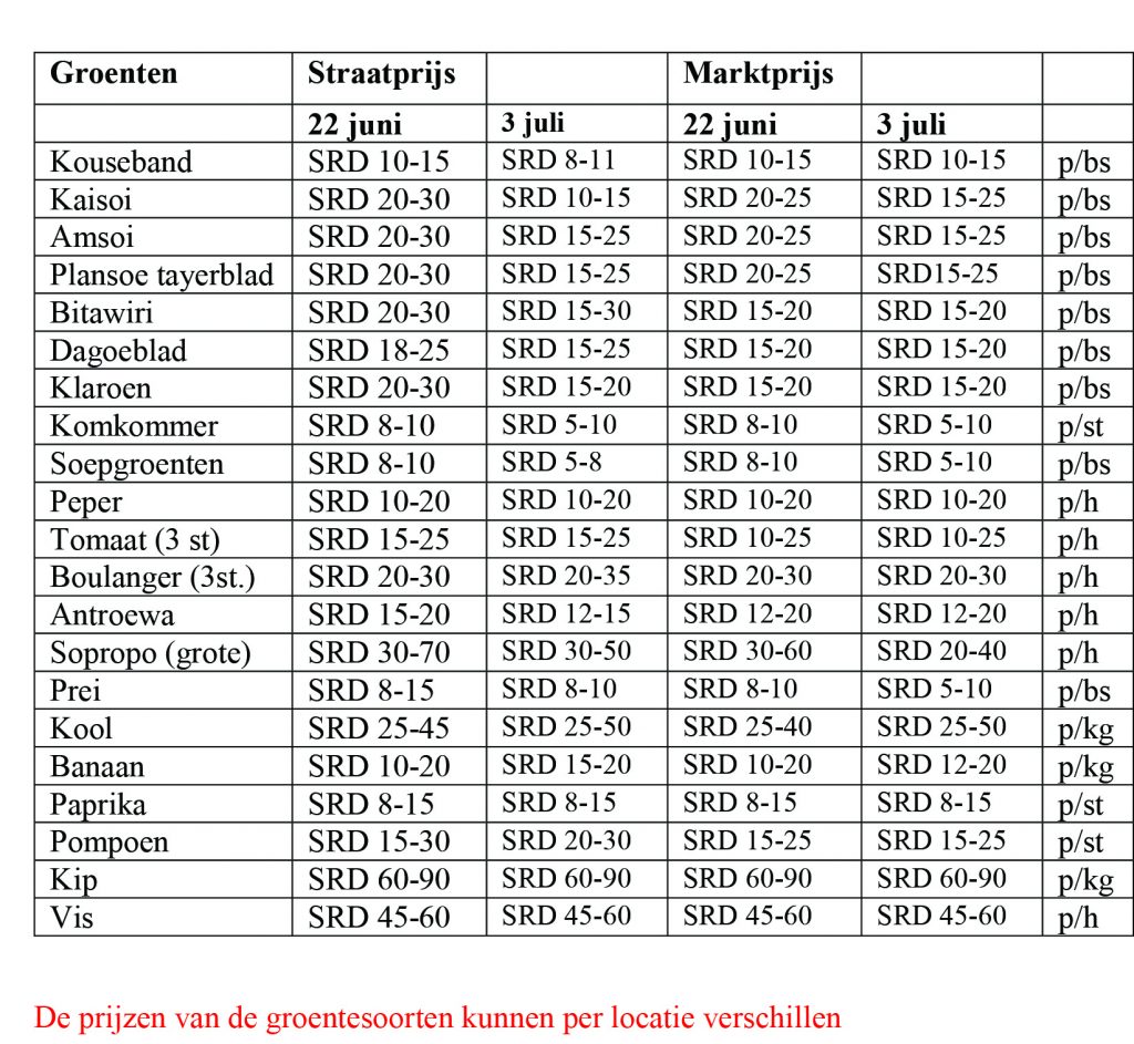 ‘De prijzen op de markt zijn nog steeds om te schrikken. Toen ik de markt rondliep, leek het alsof ik elders was’, zei een burger op vrijdag 2 juli tegenover de krant. ‘Alles was letterlijk vanaf SRD 10. Ik dacht toen over te stappen van bladgroenten naar aardvruchten, maar durfde het uiteindelijk ook niet, aardvruchten kon je krijgen vanaf SRD 20. Ik weet helemaal niet wat er gebeurt in ons land’, benadrukt de burger. ‘Maar er moet een verandering komen. Zo gaan we niet vooruit, maar juist achteruit.’