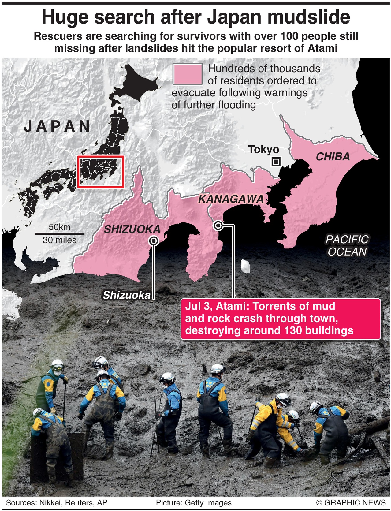 De aardverschuiving vond zaterdagochtend plaats na dagen van zware regenval in Atami, een stad van 36.800 inwoners en ongeveer 100 km ten zuidwesten van Tokio.