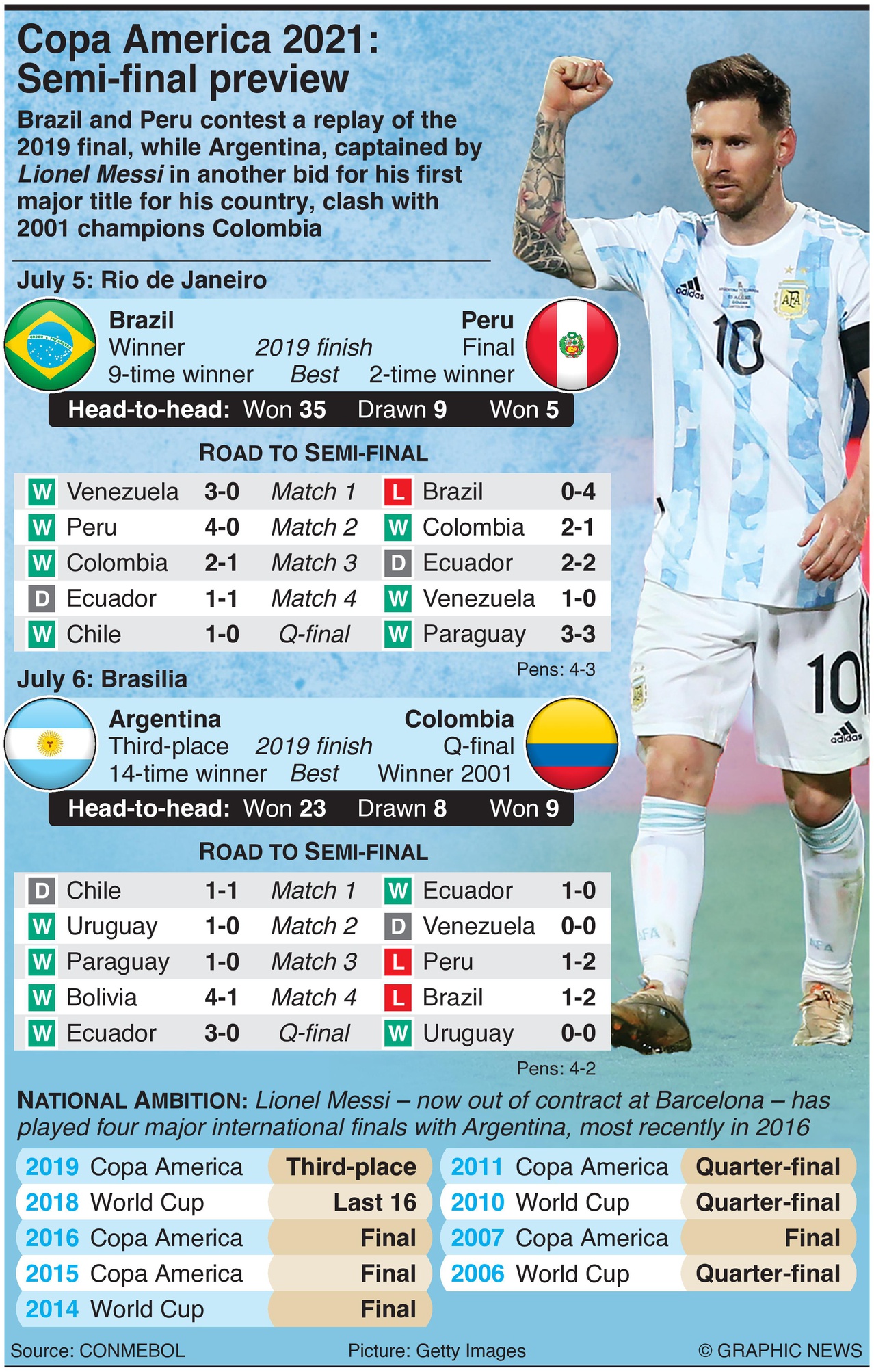 5 juli 2021 – 6 juli 2021 – De 47e Copa America bereikt de halve finale. Brazilië en Peru betwisten een herhaling van de finale van 2019, terwijl Argentinië, aangevoerd door Lionel Messi in een andere poging voor zijn eerste grote titel voor zijn land, botst met 2001-kampioen Colombia. Het Maracana-stadion van Rio de Janeiro zal op 10 juli de parade van het paradepaardje houden.