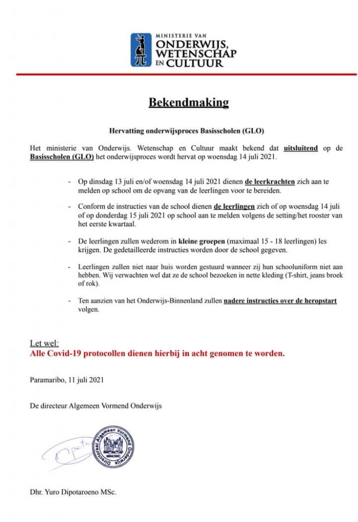 De regering heeft zaterdag 10 juli nieuwe Covid-maatregelen aangekondigd waaronder het openen van scholen in het basisonderwijs vanaf woensdag 14 juli. Opmerkelijk genoeg is er pas in de loop van zondag geen officiële bekendmaking vanuit het ministerie van Onderwijs, Wetenschap en Cultuur gekomen (zie onderaan).