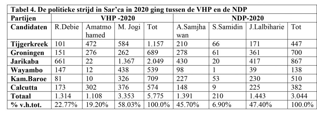 De politieke strijd in Saramacca, in 2020, ging tussen de VHP en de NDP. In 2015 was de NDP sterker dan de VHP, maar in 2020 is de situatie veranderd (zie tabel 3).
