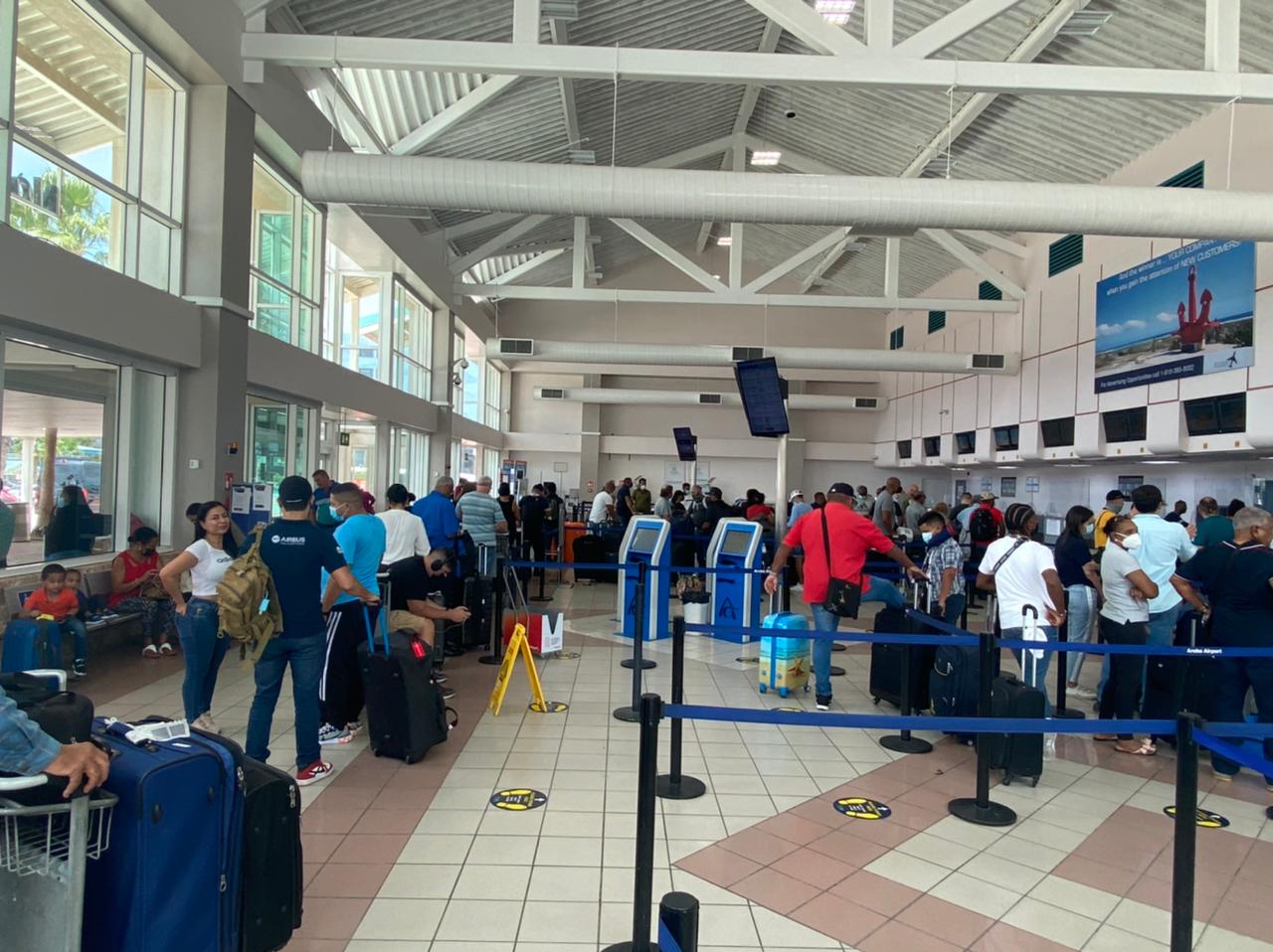 De op Aruba dinsdag gestrande passagiers van de SLM-vlucht, uitgevoerd door de Amerikaanse chartermaatschappij World Atlantic Airlines, van Miami-Aruba-Paramaribo, zijn woensdagmiddag 14 juli op de luchthaven van Aruba in afwachting van vertrek naar Suriname.