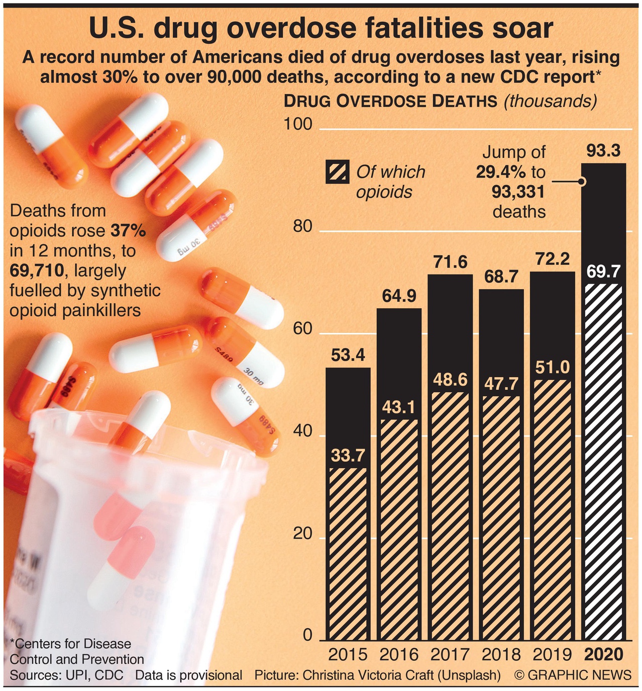 In 2020 werden naar schatting 93.331 sterfgevallen door een overdosis drugs gemeld, vergeleken met 72.151 geschatte dodelijke slachtoffers het jaar ervoor.