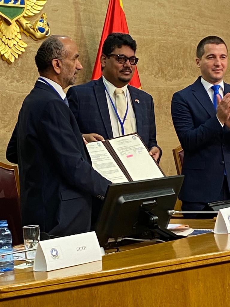 (Het assembleelid Asiskumar Gajadien op de foto met (r) GCTP voorzitter Mohammad Al-Jarwan en (l) Aleksa Bečic, parlementsvoorzitter van Montenegro na de ondertekening van het document die de officiele toetreding van Suriname tot de IPTP bevestigd.)