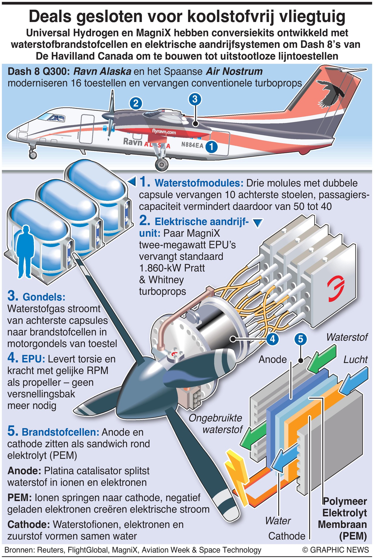 Universal Hydrogen en MagniX hebben conversiekits ontwikkeld met waterstofbrandstofcellen en elektrische aandrijflijnen om De Havilland Canada Dash 8’s om te zetten in emissievrije vliegtuigen.