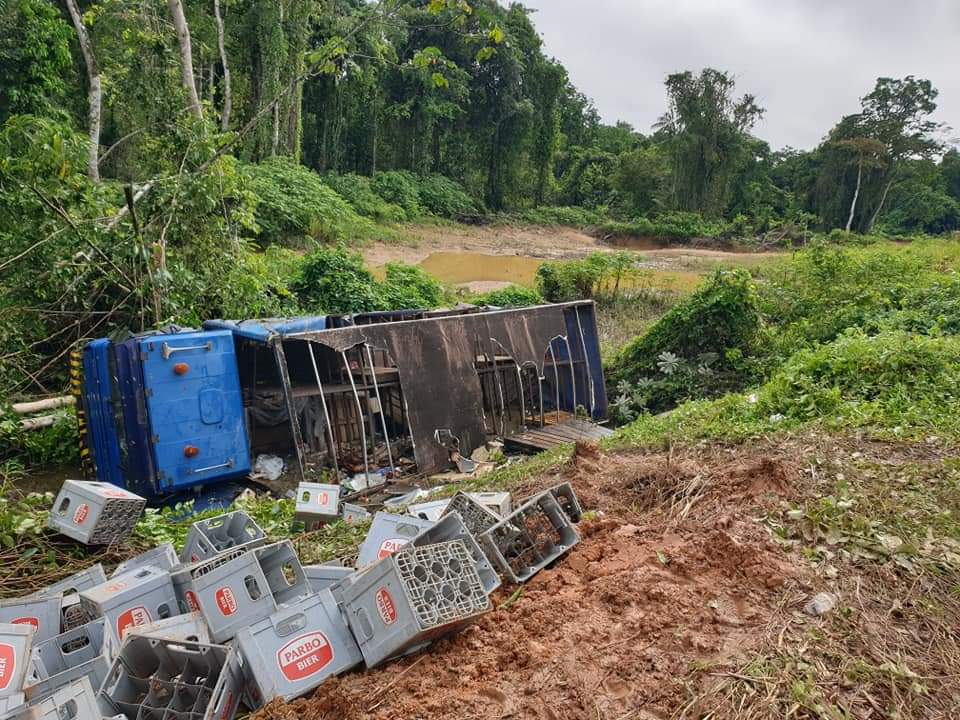 Een vrachtauto volgeladen met Parbo bier-kratten en lege flessen is zondagmiddag 25 juli van de weg geraakt op de weg naar Atjoni en in een trens beland.
