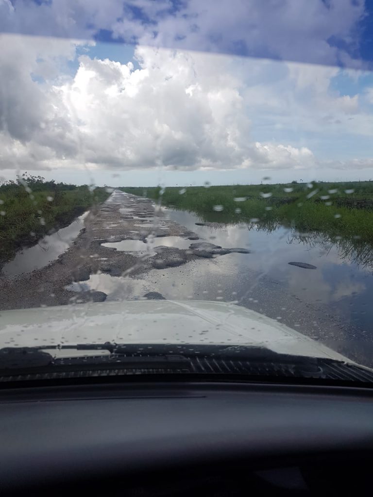 ‘Wij maakten een pitstop te Totness. Daar zagen wij een met twee lekke banden gestrande voertuig van de politie. Het ongemak wordt veroorzaakt door vooral de scherpe randen van de kuilen die bezaaid liggen op de Afdamming Burnside-Wageningen. Behalve lekke banden raken de onderstellen en andere delen van de voertuigen beschadigd. Ook op de terugweg stonden twee bestelbussen met lekke banden voor reparatie bij die servicestation.’