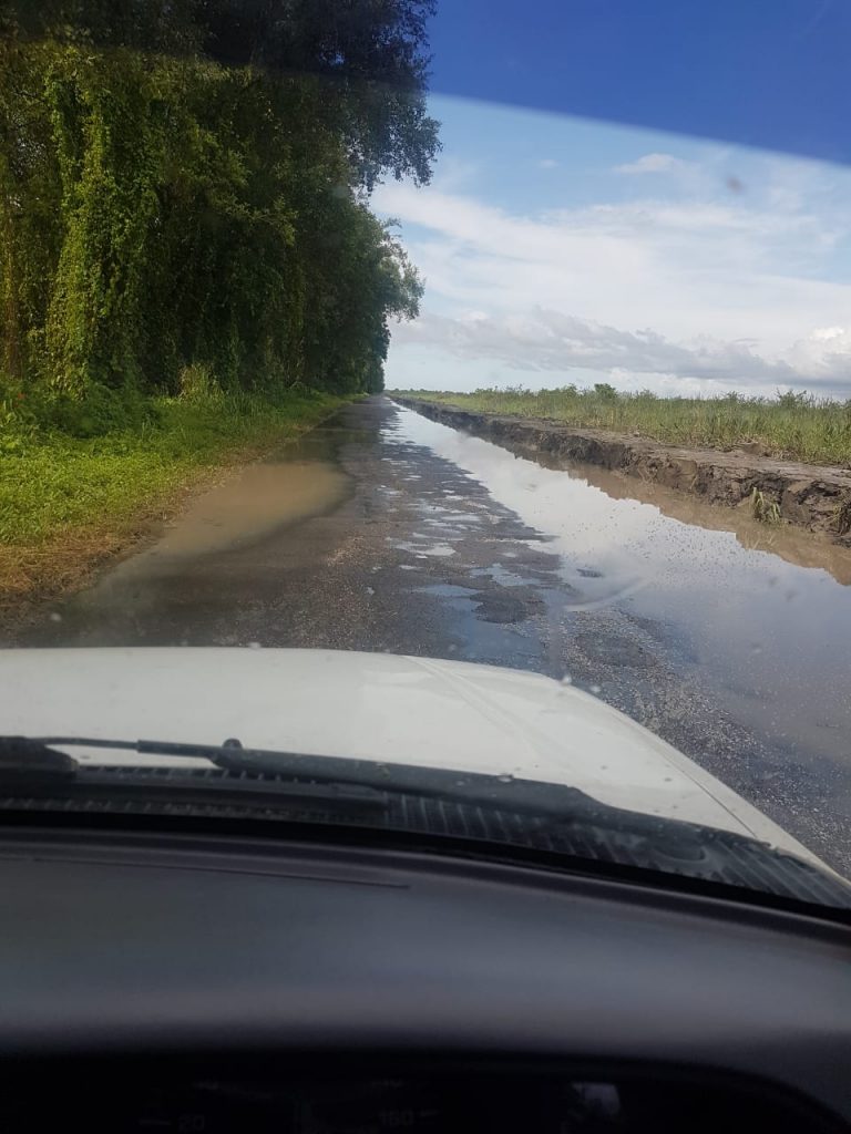 ‘Gezien de industriële ontwikkeling die West-Suriname in verband met oliefondsen voor de kust tegemoet gaat, is de Oost-Westverbinding belangrijker dan ooit. Het wordt met de dag duidelijker dat het weggedeelte Afdamming verlegd moet worden. Het is niet ondenkbaar, dat het wassende water van het een op ander moment de afdamming die als weg gebruikt wordt. kan meesleuren.’ Door de vele regens stroomt het water steeds over de weg. Een oplossing is bedacht door een kleidam op te werpen, maar hiermede is het probleem absoluut niet opgelost. Nu drukt het water van de zijde van de zee, terwijl het hemelwater gewoon op het wegdek blijft liggen met funeste gevolgen voor het asfalt. De Afdamming is binnen 3 maanden zijn zoveel grote brokken asfalt kwijtgeraakt dat de vele en grote gaten niet eens meer met een fiets te ontwijken zijn.