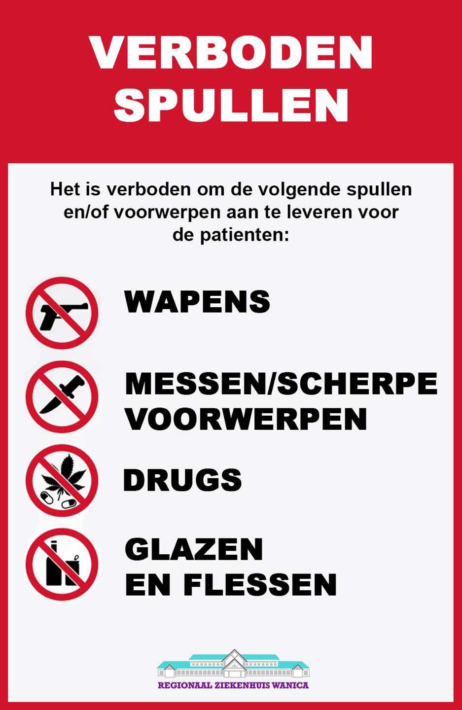 Het RZW heeft een aanplakbiljet uitgebracht waarin mensen die familieleden willen bezoeken die in het ziekenhuis zijn opgenomen, worden gewaarschuwd om geen wapens, drugs, messen/scherpe voorwerpen en glazen en flessen mee te nemen.