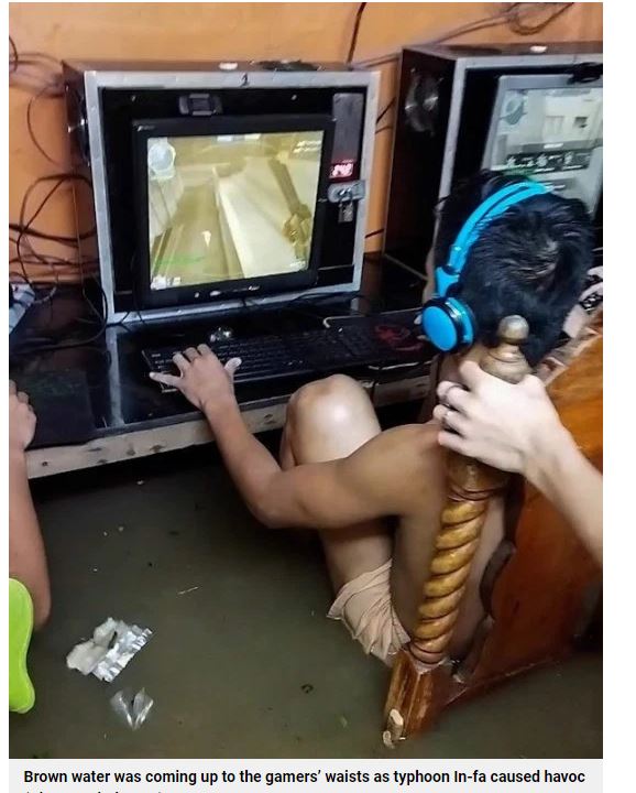 Op beelden van een internetcafé is te zien hoe de jongens zich uitsloven in een multiplayer-spel terwijl modderig regenwater tot aan hun stoelen komt.