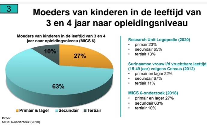 Uit de literatuur blijkt ook, dat naast het opleidingsniveau van de moeder ook andere factoren effect hebben op deze ontwikkeling. Welke factoren bepalend zijn voor Suriname, is nog niet via verdiepende kwantitatieve statistische analyse vastgesteld. Naar aanleiding hiervan is onderzoek uitgevoerd naar het effect van het opleidingsniveau van de moeder op de ontwikkeling van kinderen in de leeftijd van 3 en 4 jaar in Suriname. Bij dit onderzoek zijn analyses verricht uit het databestand van het Suriname Multiple Indicator Cluster Survey (MICS) 6-onderzoek, uitgevoerd in 2018 door het Ministerie van Sociale Zaken en Volkshuisvesting in samenwerking met het Algemeen Bureau voor de Statistiek (ABS).