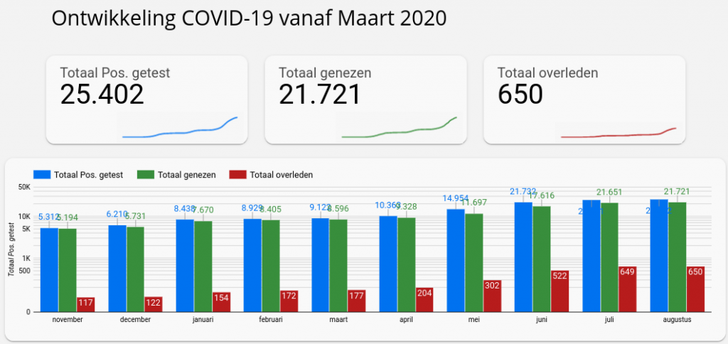Het totaal aantal met Covid-19 besmette personen, sinds de uitbraak medio maart 2020, bedraagt nu 25.402.