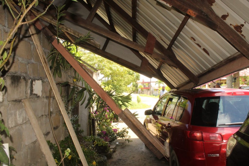 Een deel van het dak van de buurman rust ook op het balkon. De buurman is nog in het westelijke district Nickerie. Hij is ondertussen gebeld en komt naar de stad. Meneer Glenn heeft zijn verzekeringsmaatschappij gebeld. Hij hoopt dat de schade wordt vergoed.