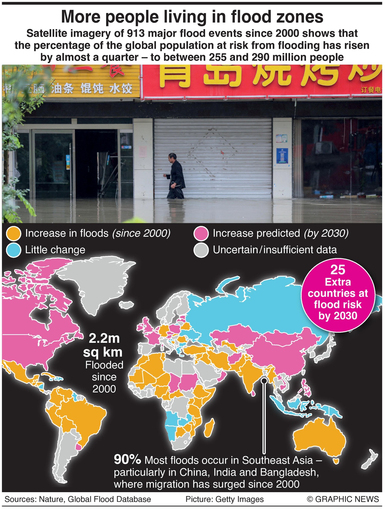 Satellietbeelden van 913 grote overstromingen sinds 2000 laten zien dat het percentage van de wereldbevolking dat gevaar loopt door overstromingen met bijna een kwart is gestegen, tot tussen de 255 en 290 miljoen mensen.