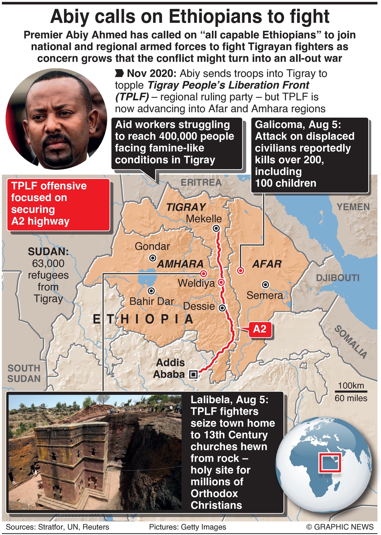 Premier Abiy Ahmed heeft “alle capabele Ethiopiërs” opgeroepen om zich bij de nationale en regionale strijdkrachten aan te sluiten om de Tigrayan-jagers te bestrijden, aangezien de bezorgdheid groeit dat het conflict zou kunnen uitmonden in een totale oorlog.