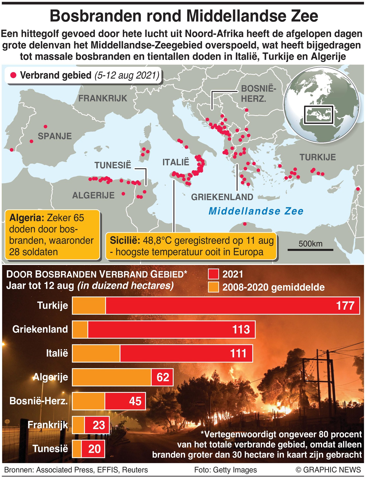 Een hittegolf gevoed door hete lucht uit Noord-Afrika heeft de afgelopen dagen grote delen van het Middellandse Zeegebied overspoeld, wat heeft bijgedragen aan enorme bosbranden en tientallen mensenlevens in Italië, Turkije en Algerije.