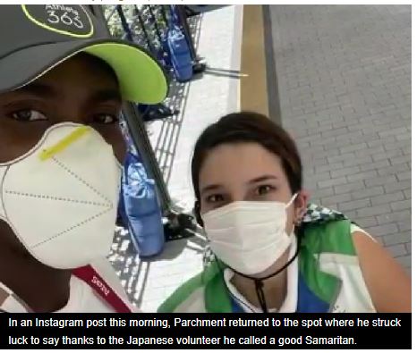 In de video nam Parchment een bus om de vrouw, genaamd Trijana, te vinden. Hij betaalde haar terug, toonde haar zijn gouden medaille en gaf haar een Team Jamaica-shirt.