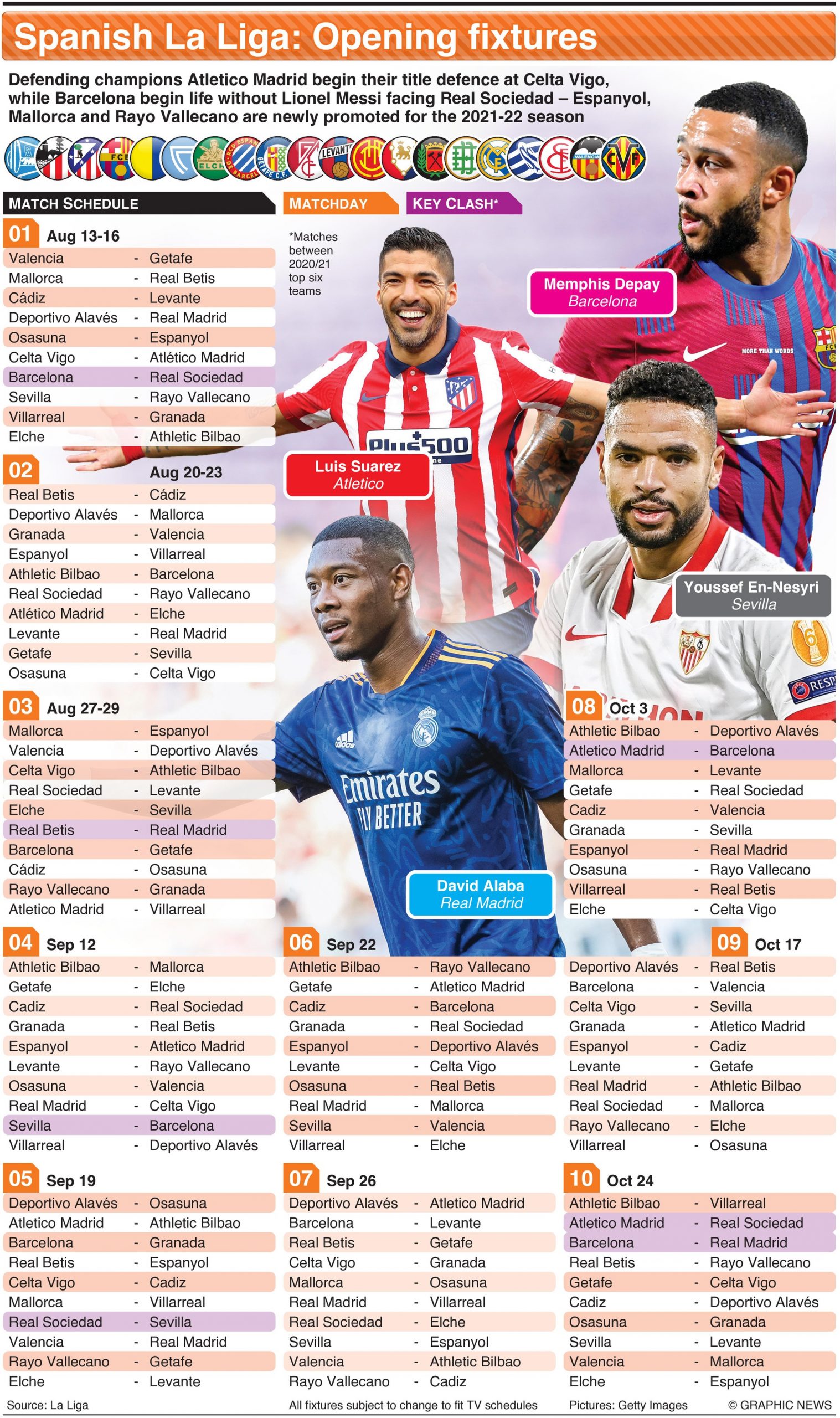 Het Spaanse Primera Division-seizoen, officieel bekend als La Liga. Titelverdediger Atletico Madrid begint hun titelverdediging bij Celta Vigo, terwijl Barcelona het leven begint zonder Lionel Messi tegenover Real Sociedad — Espanyol, Mallorca en Rayo Vallecano zijn gepromoveerd voor het seizoen 2021-22.