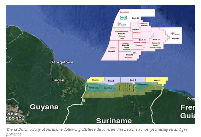 In Suriname zijn de belangrijkste offshore-blokken al verworven door de grote internationale bedrijven zoals ExxonMobil, Statoil en Hess, via participatieovereenkomsten met hun staatsbedrijf Staatolie.