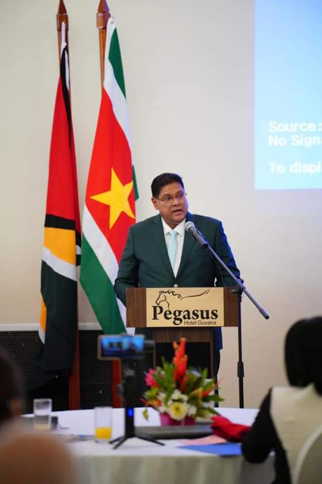 President Santokhi zei, dat Suriname en Guyana als buurlanden “zekere en wederzijdse” voordelige banden moeten onderhouden, aangezien succes in de huidige uitdagende wereld alleen kan worden bereikt door veerkrachtige en welvarende economieën en vreedzame samenlevingen op te bouwen. Hij zei dat om dit te bereiken het absoluut noodzakelijk is dat de landen samenwerken in het kader van de regeringen en in het kader van de samenwerking tussen de publieke en private sector. “We begrepen allebei meteen dat we een historische kans hebben toen we in november 2020 het Surinaams Guyana Strategisch en Samenwerkingsplatform (SGCP) lanceerden als een mechanisme om de bilaterale samenwerking te versterken, economische groei te bevorderen en investeringsmogelijkheden te creëren.”