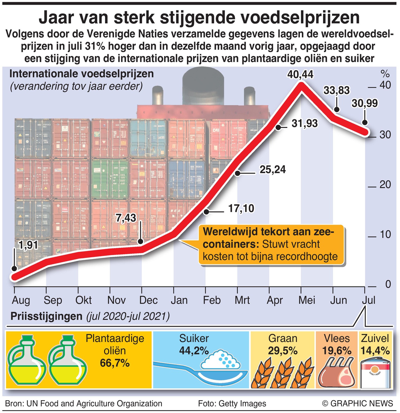 Volgens gegevens van de Verenigde Naties stegen de wereldwijde voedselprijzen in juli met 31% ten opzichte van dezelfde maand vorig jaar, als gevolg van een stijging van de internationale prijzen van plantaardige oliën en suiker.