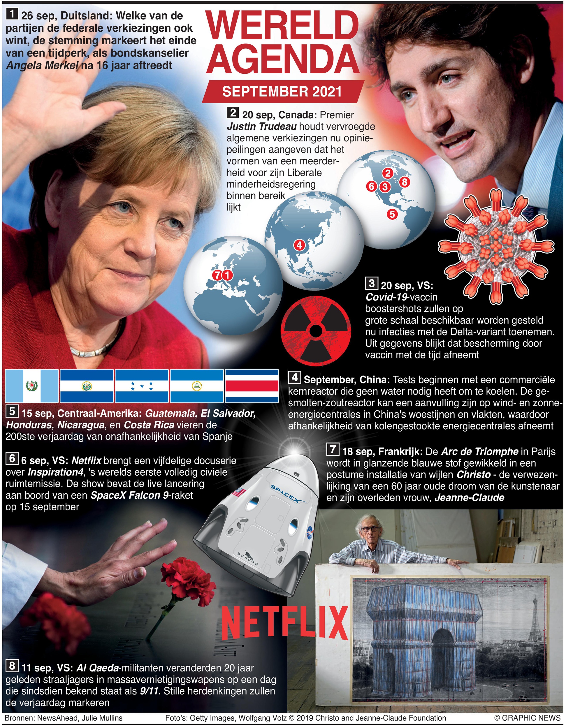 Elke maand publiceert Graphic News een Wereldagenda met komende evenementen die de wereld de komende maand vorm zullen geven. Evenementen in september zijn onder meer de federale verkiezingen in Duitsland, een snelle algemene verkiezing in Canada, de 20e verjaardag van 9/11 en de inhuldiging van de Arc de Triomphe door wijlen kunstenaar Christo.