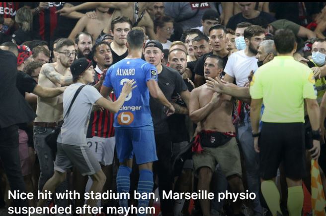 Nice kreeg de opdracht om hun volgende thuiswedstrijd woensdag achter gesloten deuren te spelen, terwijl een lid van de achterkamertjes van Marseille werd geschorst na de chaos tijdens een wedstrijd in de Franse Ligue 1 tussen de twee teams afgelopen weekend.