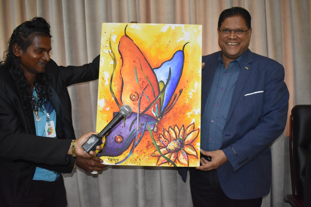 Kunstenaar Dwarka kreeg een maand geleden een droom om een schilderij te maken voor het staatshoofd. “Ik zag een mooie vlinder zitten op een zonnebloem. De vlinder symboliseert de president en de bloemen moeten we zien als de Surinaamse gemeenschap. Onze president werkt dag en nacht en in het kader van een jaar regering Santokhi-Brunswijk heb ik gemeend dit kunstwerk aan de vader des vaderlands te overhandigen. Hij beschermt ons allen en het is een mooi moment om ook hem op deze manier te gedenken”, aldus Dwarka.