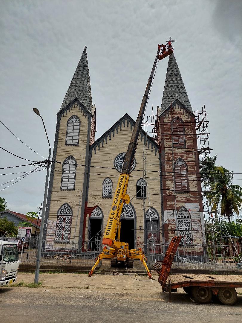 De priester wees ook op de restauratie van de kerk. Hoogwerkers zijn op het moment bezig om de oude houten kruizen te vervangen door aluminium exemplaren, die bijkans levenslang meegaan.