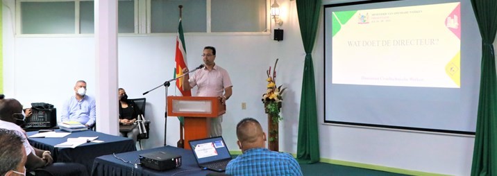 Minister Riad Nurmohamed gaf gedurende zijn presentatie aan welke afdelingen volgens het nieuwe organogram rechtstreeks onder de minister vallen en hoe deze van dienst kunnen zijn voor de vier directoraten van Openbare Werken.