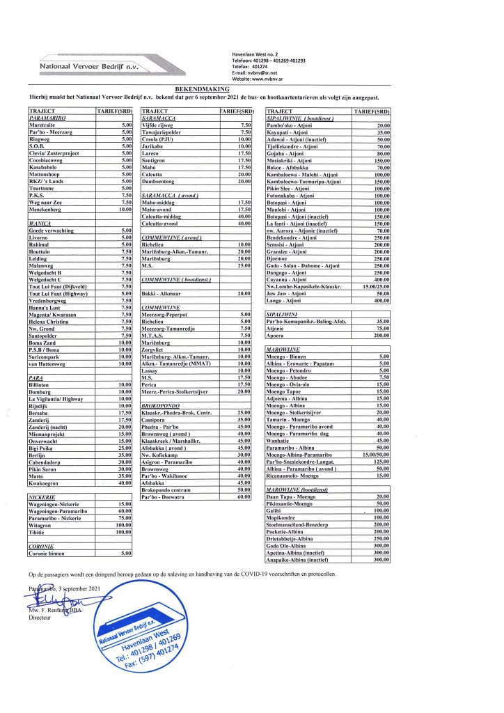 Het Nationaal Vervoer Bedrijf Suriname (NVB) heeft vrijdag 3 september haar nieuwe aangepaste kaarten tarieven bekendgemaakt. Deze tarieven gaan in per maandag 6 september: