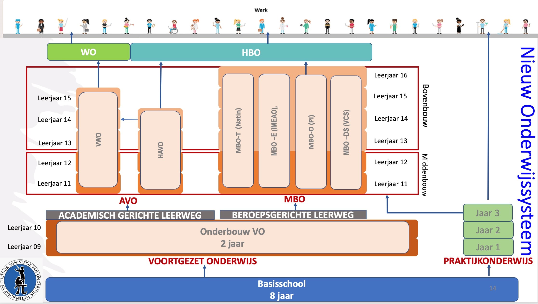 In de nieuwe structuur zal het voortgezet onderwijs, dat na de basisschool start, opgebouwd zijn uit onder-, midden- en bovenbouw.