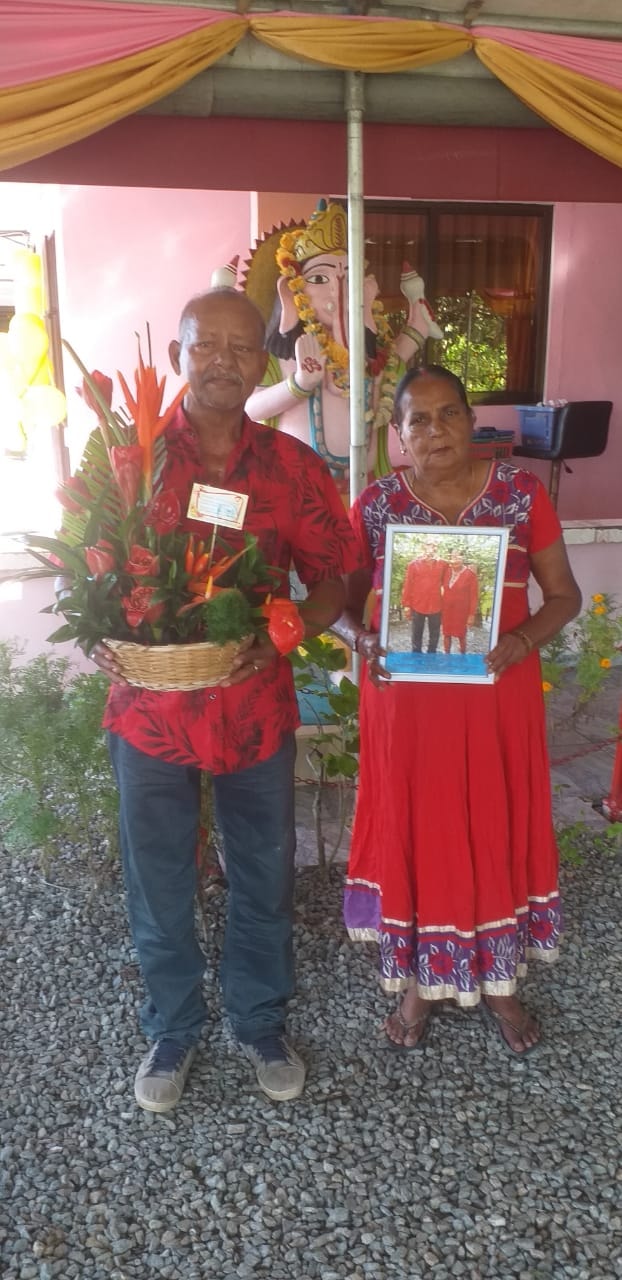 Lloyd Amatoeloes en mevrouw Anuska Beukenhout en de Assistent Bestuursopzichter de heer Bhoewar, vertegenwoordigden de districtscommissaris. Het echtpaar mocht een bloemstuk, een felicitatiekaart en een ingelijste foto in ontvangst nemen. De financiele middelen die gepaard gaan bij zo’n mijlpaal worden overgemaakt naar een bankrekeningnummer opgegeven door het echtpaar.