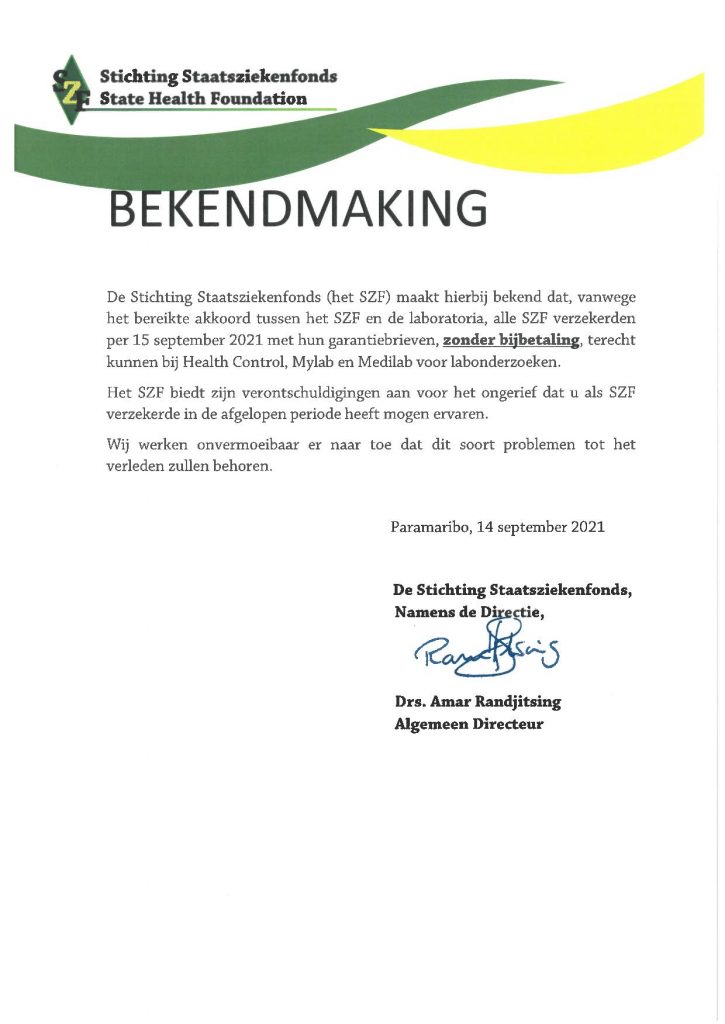 De Stichting Staatsziekenfonds, SZF, heeft dinsdag bekendgemaakt, dat door een bereikt akkoord tussen het SZF en de laboratoria, alle SZF-verzekerden vanaf woensdag 15 september met hun garantiebrieven, zonder bijbetaling, terecht kunnen bij Health Control, Mylab en Medilab voor labonderzoeken.