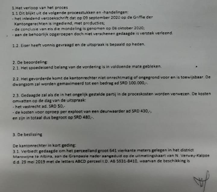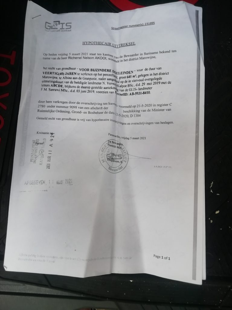 Landmeetkundige werkzaamheden op het perceel in opdracht van de heer Akooi zijn zonder opgaaf van redenen abrupt stopgezet op 25 februari 2021 door districtscommissaris Clyde Hunswijk van het bestuursressort Marowijne Noord-Oost.