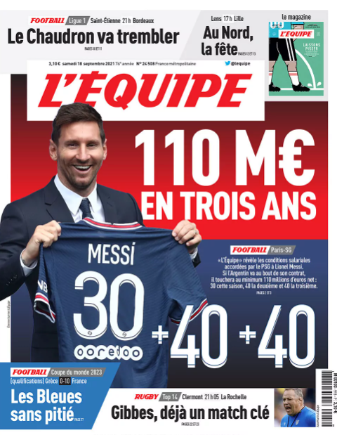 Messi zou bij PSG in zijn eerste seizoen dertig miljoen euro krijgen en in zijn tweede en eventuele derde seizoen telkens veertig. L’Équipe stelde, dat er een optie voor een derde jaar in het tweejarige contract van de 34-jarige aanvaller staat.