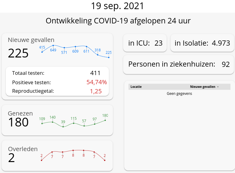 225 Covid-positief geteste personen zondag 19 september – 2 patiënten overleden aan virus