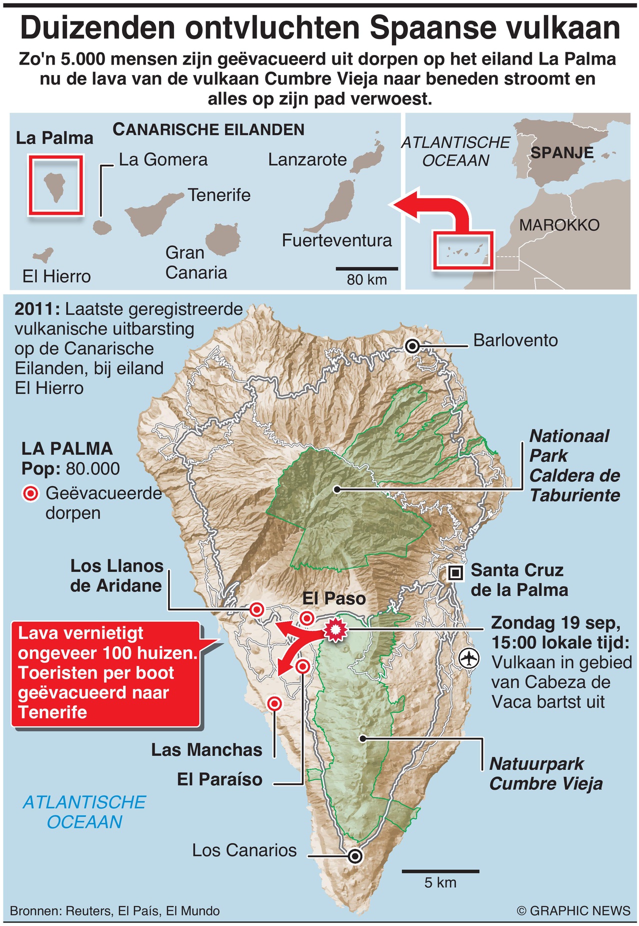 Op het Spaanse Canarische eiland La Palma is zondag een vulkaan uitgebarsten. Daardoor verspreiden zich rook, as en enorme hoeveelheden lava vanuit het zuiden van het eiland.