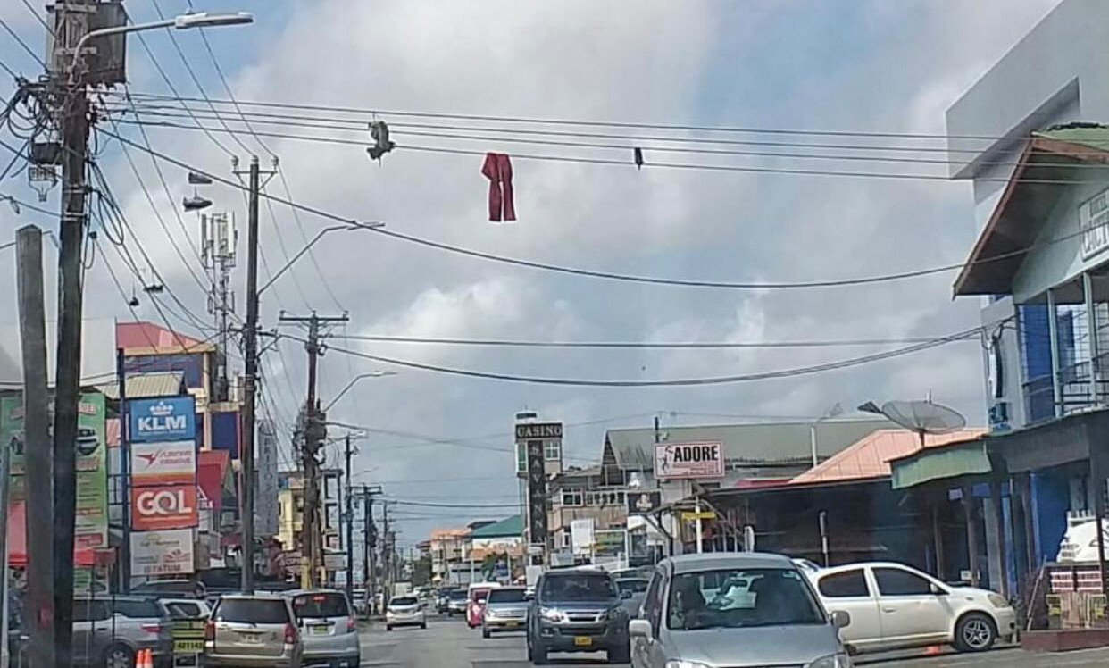 Hoe vaak zie je een spijkerbroek hangen aan een elektriciteitskabel van de Energie Bedrijven Suriname, EBS? Niet elke dag, in ieder geval. Dat was echter wel het geval in Paramaribo. Deze foto hiervan ging viraal op social media.