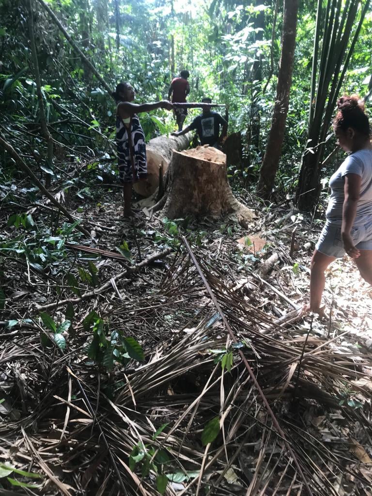 Tegen deze illegale praktijken is echter nog niet opgetreden en er is een deel van de boomstammen uit het bos gehaald. Het dorpshoofd ging diezelfde dag naar Santigron en heeft gesproken met een kapitein van het dorp. “Die heeft me verteld dat de mensen (man en vrouw) van Santigron zijn aangesproken. Er is aan mij geadviseerd om de zaak met de politie af te handelen”, zegt Van der Bosch.
