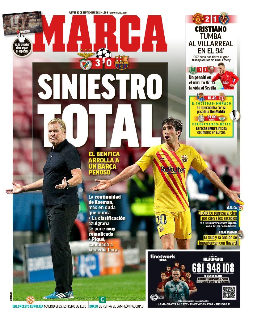 “Nieuw drama voor Barça in Da Luz”, aldus de Catalaanse krant Mundo Deportivo. “Een monumentale klap voor Barcelona, bespeeld door Benfica in het stadion van de Catalaanse debacles. Ruim 400 dagen na de 2-8 tegen Bayern München wordt in Da Luz met 0-3 verloren van de Portugezen, dezelfde uitslag als eerder tegen Bayern zelf. Nul punten, nul goals. Ronald Koeman balanceert op een koord. De tactische strijd was duidelijk: Jorge Jesus was dapper, Koeman te voorzichtig. De volgende twee Europese wedstrijden tegen Dinamo Kiev (eerst thuis, dan uit) worden twee finales.”