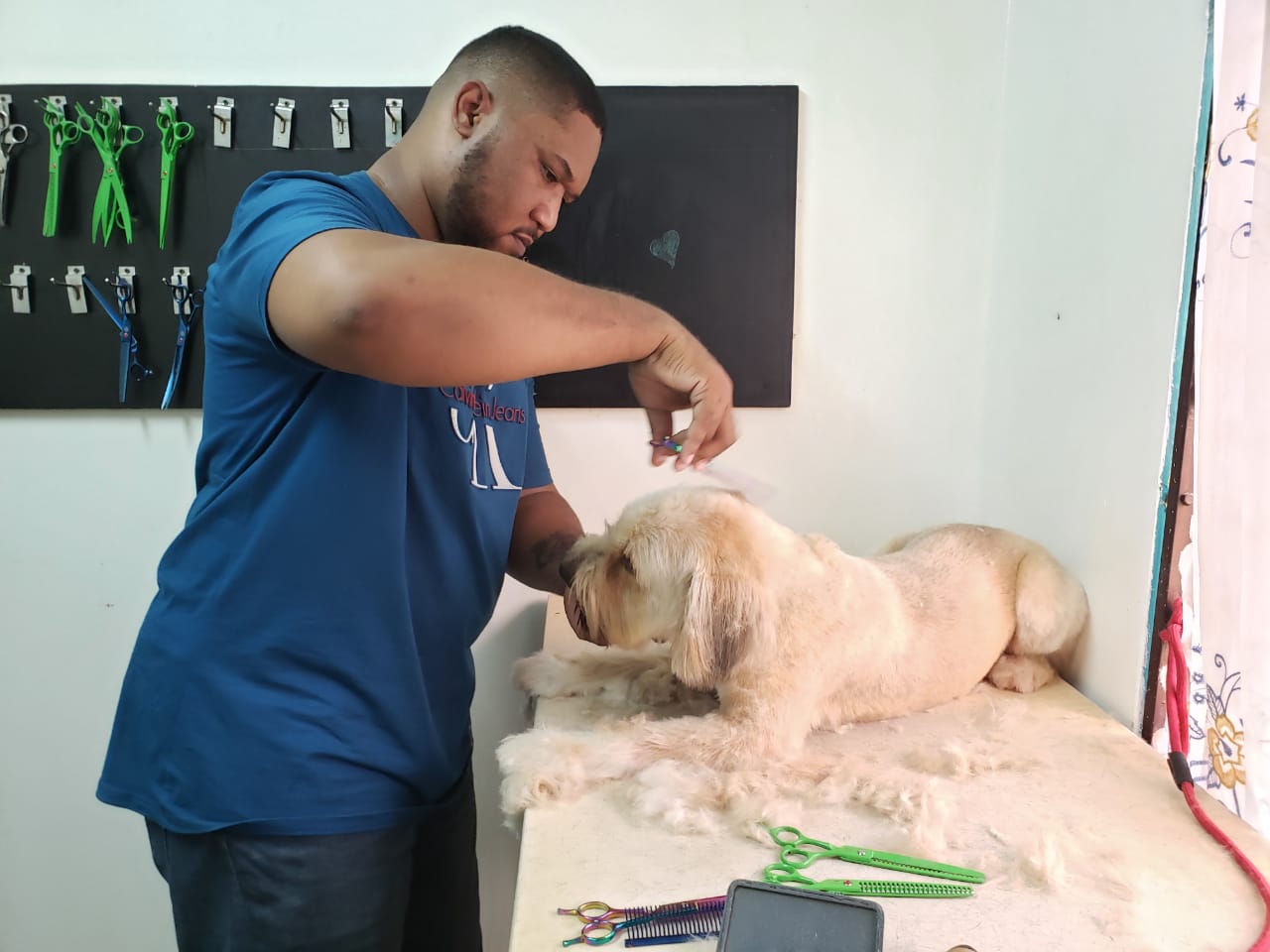 Romano is een echte dierenliefhebber, maar honden zijn toch zijn ding. Hij is letterlijk met en tussen honden opgegroeid. Zijn moeder had er 14, dus hij was de hele dag omringd door deze trouwe viervoeters. Toen hij ouder werd en zelfstandig is gaan wonen is zijn passie voor honden gebleven en bleef hij bezig zijn met honden. Hij werkte een tijdje voor de hondentrainer de heer Guicherit. Zo leerde hij het een en ander over hondenpsychologie. Het was dierenarts Resopawaro, met wie hij goed bevriend was, die hem vroeg of hij annex diens dierenpoli een dierenkapperszaak wilde beginnen. Romano wilde het wel proberen. Hij deed heel veel aan zelfstudie en deed proefknippen bij honden van vrienden en kennissen. Dat ging goed en niet lang daarna was genoeg zelfvertrouwen opgebouwd om zijn hondengroomerszaak bij de dierenpoli van Resopawiro te beginnen. De fysieke connectie met de dierenpoli had niet beter gekund voor zijn groomerzaak die hij ondertussen de zeer toepasselijke naam “Pawsitively Clean Doggy Spa” heeft genoemd. Hij kwam er direct in contact met hondeneigenaren en aan geïnteresseerde klanten was geen gebrek. De zaak groeide gauw uit zijn kleren, en verhuizen naar een groter pand werd noodzakelijk. In het gehuurde pand aan de Ramsoedhweg# 15 zit hij reeds ruim een jaar. De zaken gaan heel goed. Per dag krijgt hij gemiddeld 5 tot 6 honden onder zijn handen. Soms meer. Allemaal volgens afspraak. Gewoon binnen stappen met jouw hond voor een verzorgingsbeurt gaat dus helaas niet.