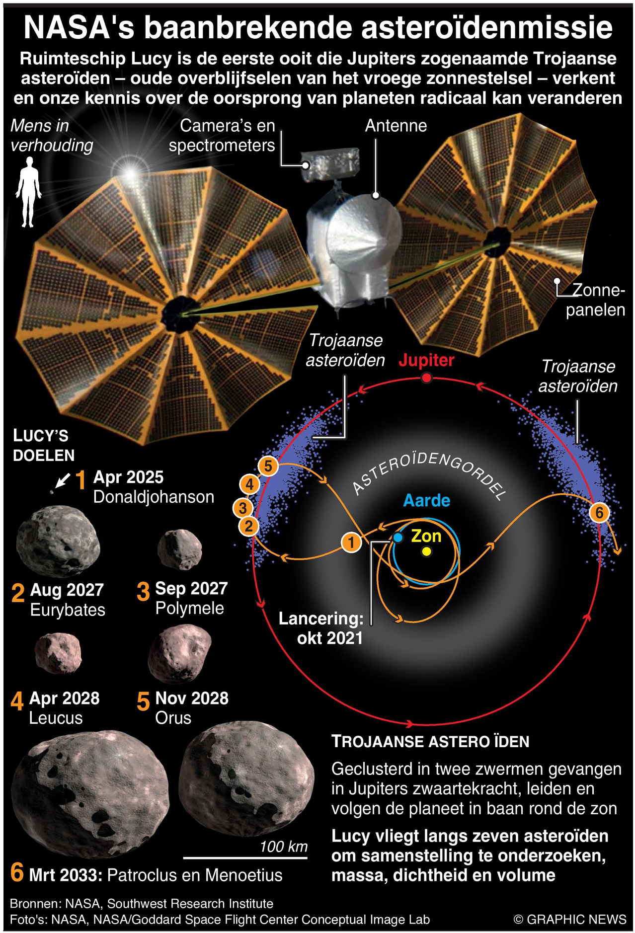 Lucy wil voorbij zeven van de talloze Trojaanse asteroïden die Jupiter voorafgaan en volgen op het pad van de gigantische gasplaneet rond de zon.