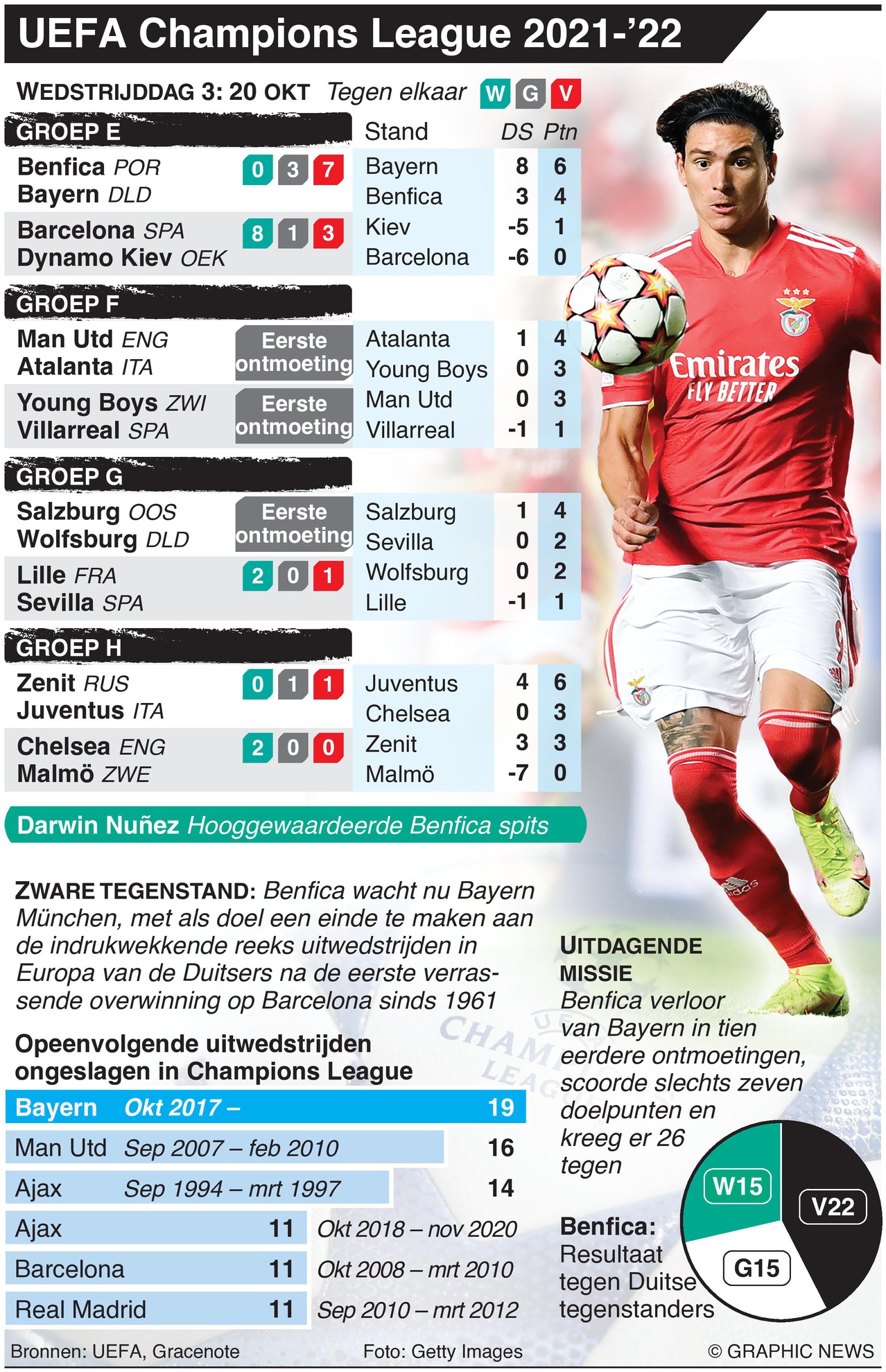 UEFA Champions League Matchday 3, woensdag wedstrijden. Europa’s nieuwe UEFA Champions League-seizoen gaat verder met belangrijke wedstrijden, waaronder Benfica – vers van het verslaan van het gewonde Barcelona – met Bayern München, Manchester United op zoek naar een zelfverzekerde prestatie tegen Atalanta en Juventus die het opneemt tegen Zenit. De finale wordt op 28 mei 2022 gespeeld in het Krestovsky Stadion, Sint-Petersburg.