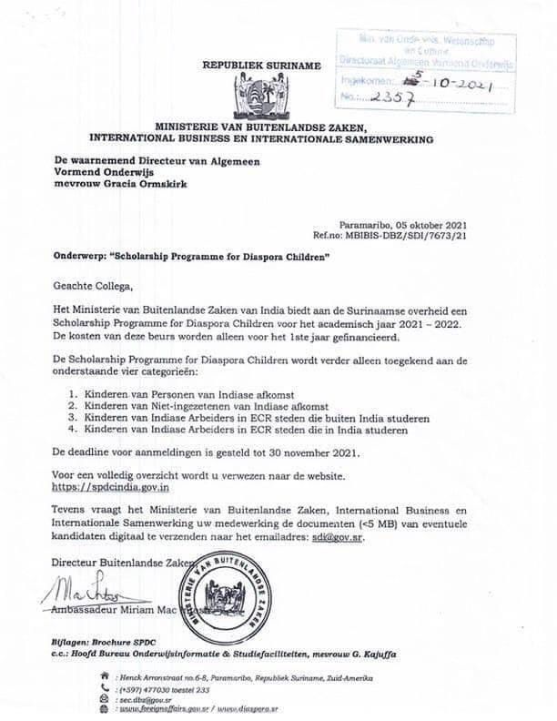 “Het ministerie van Buitenlandse Zaken van India biedt aan de Surinaamse overheid een ‘Scholarship progamme for Diaspora Children’ voor het academisch jaar 2021-2022. De kosten van deze beurs worden alleen voor het eerste jaar gefinancierd”, zo laat het ministerie van Buitenlandse Zaken, International Business en Internationale Samenwerking (BiBIS) middels een brief die gericht is aan de waarnemend directrice van Algemeen Vormend Onderwijs, Gracia Ormskirk, weten.