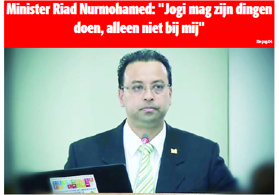 Minister Riad Nurmohamed van Openbare Werken zegt, dat VHP-parlementarier Mahinder Jogi van Saramacca keer op keer “below the belt” is gegaan tegenover de minister, maar zelfs de familie niet met rust laat. “Je mag aan mij komen, maar niet de rest. Dat kan ik niet accepteren”, stelt de bewindsman tegenover Dagblad Suriname. “Dat heeft consequenties. Het lid mag zijn dingen doen, maar niet bij mij. Ik ga niet in op de dingen die hij zegt. Iedereen kent mij, ik hoef mezelf niet te verdedigen. Ik ben er om problemen op te lossen. Het volk beslist. Mijn werk is er voor een ieder om te zien”, zegt de minister.