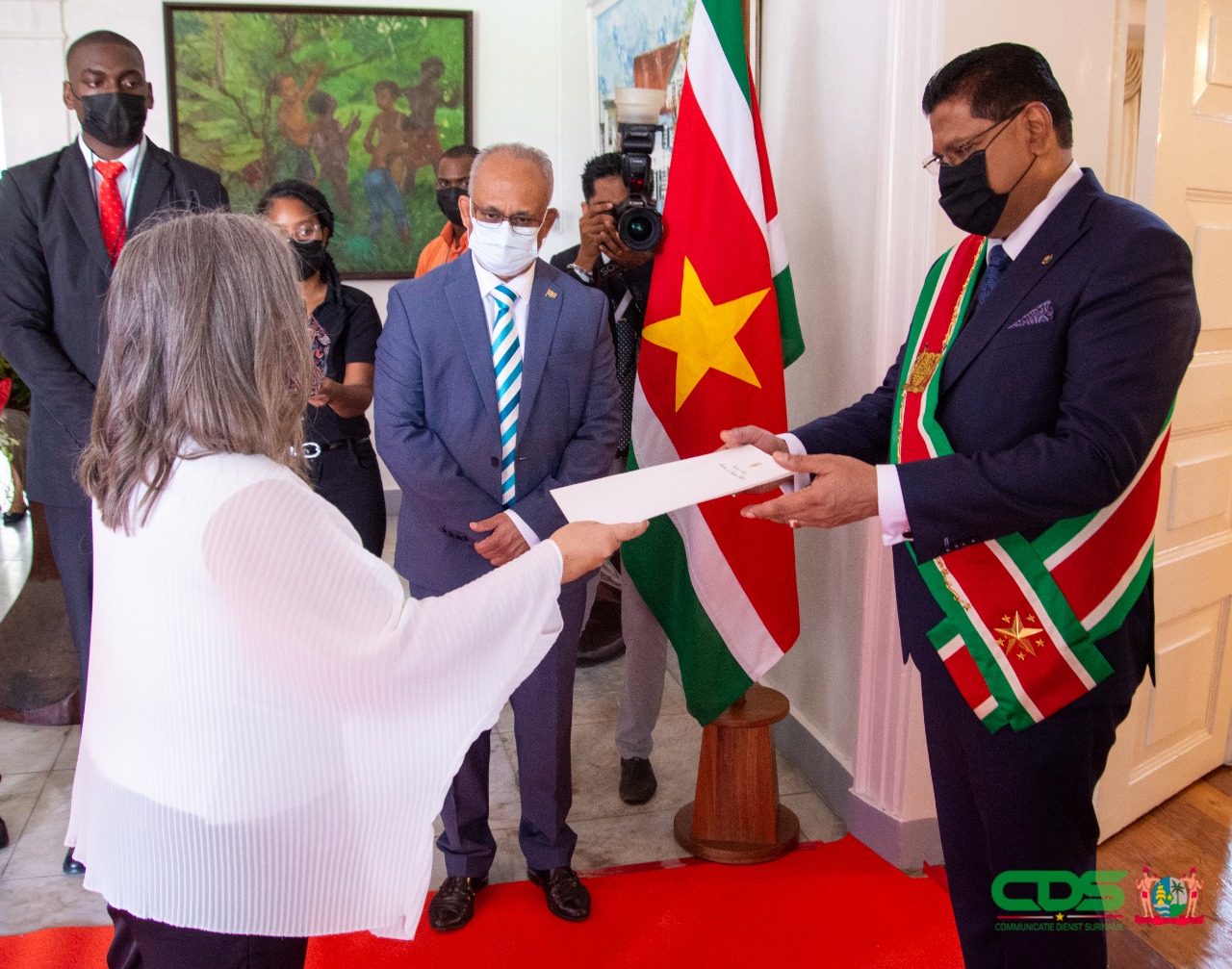 De vier niet-residerende ambassadeurs Bengü Yiğitgüden (Turkije), Mbapeua Muvangua (Namibië), Martha Cecilia Pinilla-Perdomo (Colombia) en Wellington Darío Bencosme Castaños van de Dominicaanse Republiek hebben maandag hun geloofsbrieven overhandigd aan president Chandrikapersad Santokhi op het presidentieel paleis.
