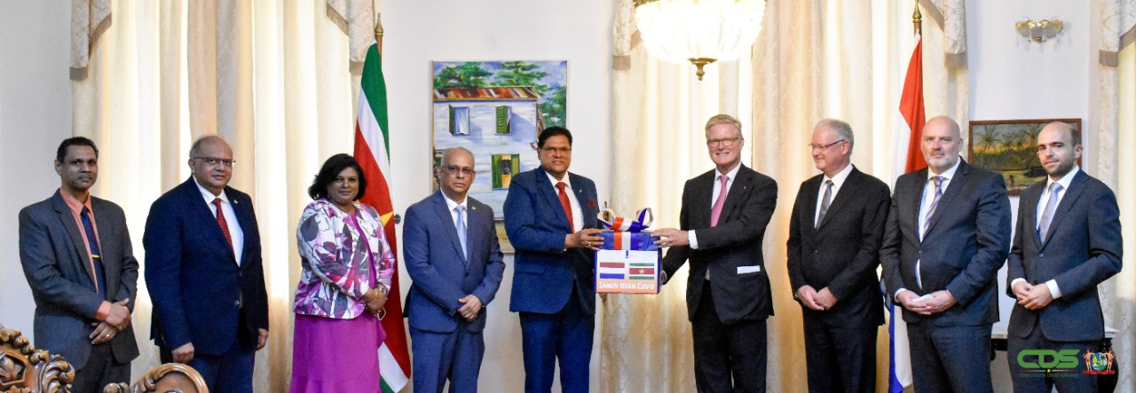 De Nederlandse ambassadeur Henk van der Zwan heeft vrijdag in het presidentieel paleis namens het Koninkrijk der Nederlanden symbolisch een partij medische hulpmiddelen overhandigd aan president Chandrikapersad Santokhi. De donatie is gedaan in het kader van het schenkingsdocument dat de ministers van Volksgezondheid Amar Ramadhin en Hugo de Jonge eerder dit jaar hebben bevestigd in Den Haag. Het gaat om een schenking van in totaal 14 zeecontainers met goederen.