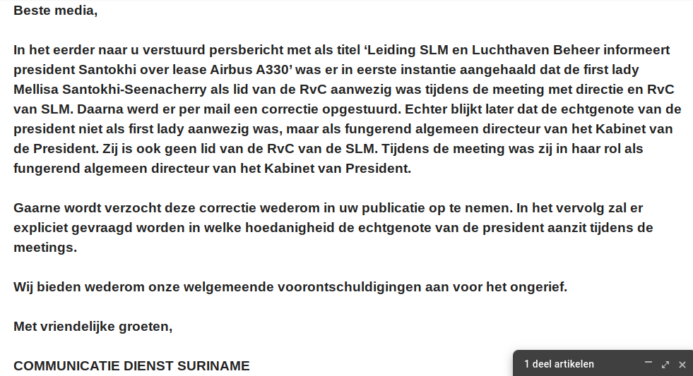 De CDS informeert de media zaterdagochtend, dat in een eerder naar de pers verzonden persbericht stond geschreven dat de First Lady als lid van de Raad van Commissarissen bij de ontmoeting met de SLM aanwezig was. Vervolgens ontving de pers een e-mail van de CDS met een correctie. De First Lady was niet aanwezig als lid van de Raad van Commissarissen, maar als First Lady, aldus de Communicatie Dienst Suriname.