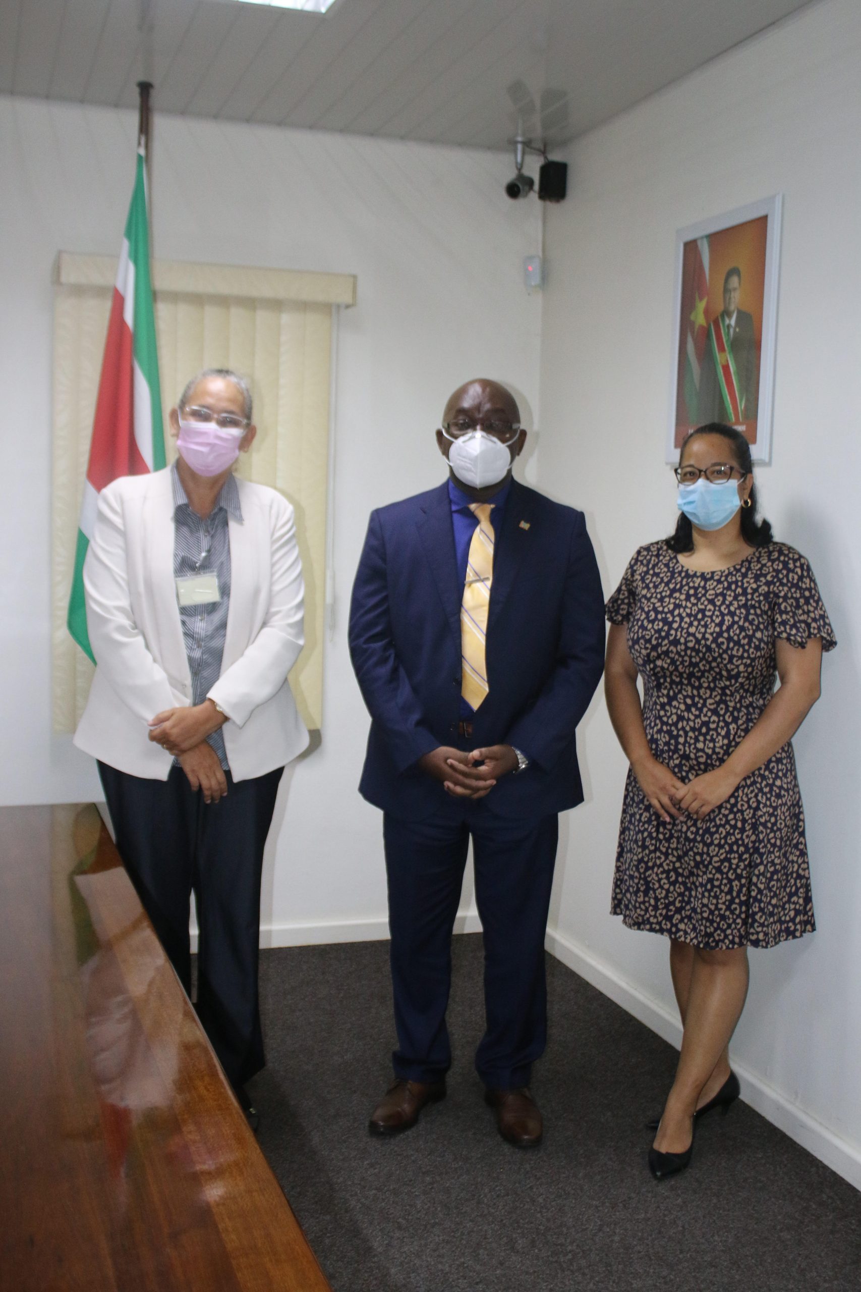 (Foto van links naar rechts: voorzitster van de commissie Toezicht Penitentiaire Inrichtingen Alida Johanns, de minister van Justitie en Politie Kenneth Amoksi en het lid Rachel Tjin Kon Kiem, psycholoog)